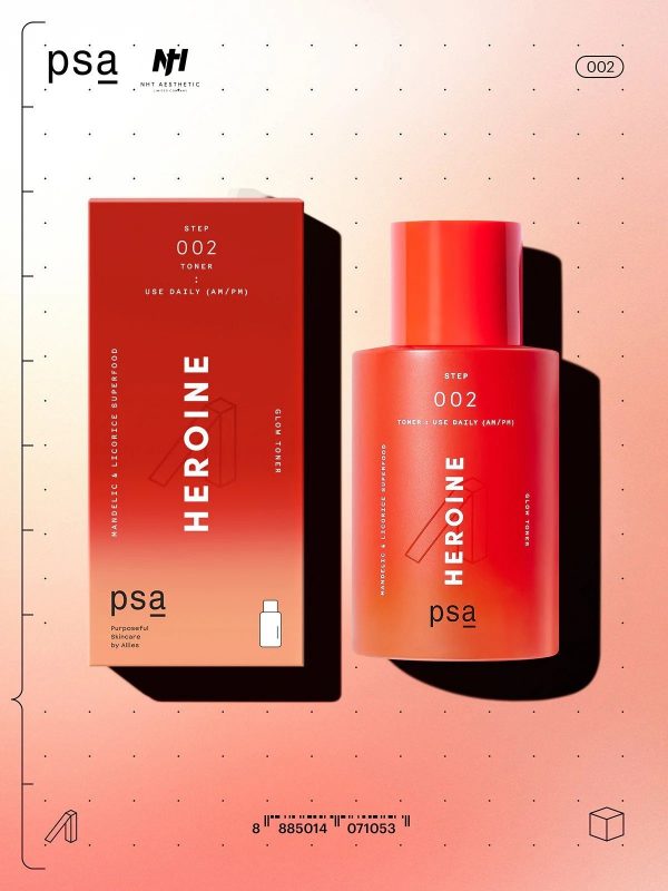 TONER HEROINE là toner cấp ẩm tẩy da chết, được PSA Skin nghiên cứu và phát triển như một giải pháp chăm da sáng tạo kết hợp 6% Mandelic & Lactic Acid, chiết xuất rễ cam thảo, Kombucha, lựu, rau má và Niacinamide nhằm tạo ra một sản phẩm đa tác động.